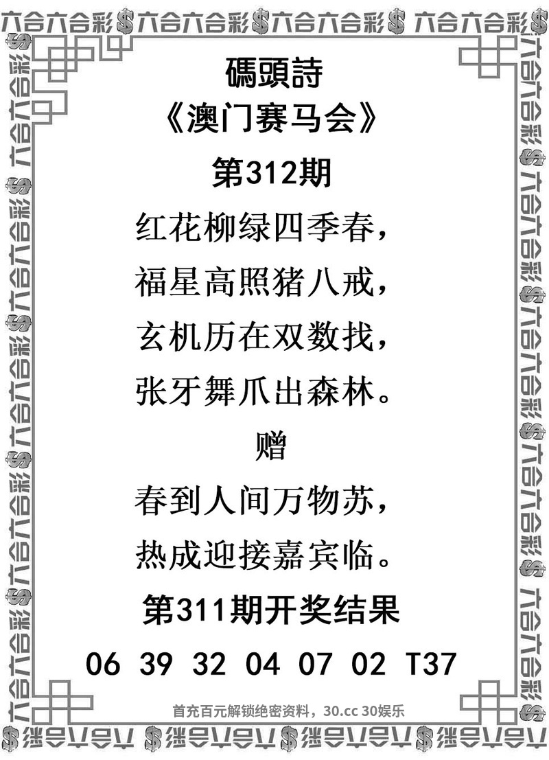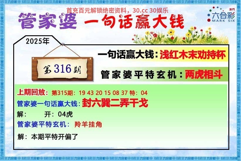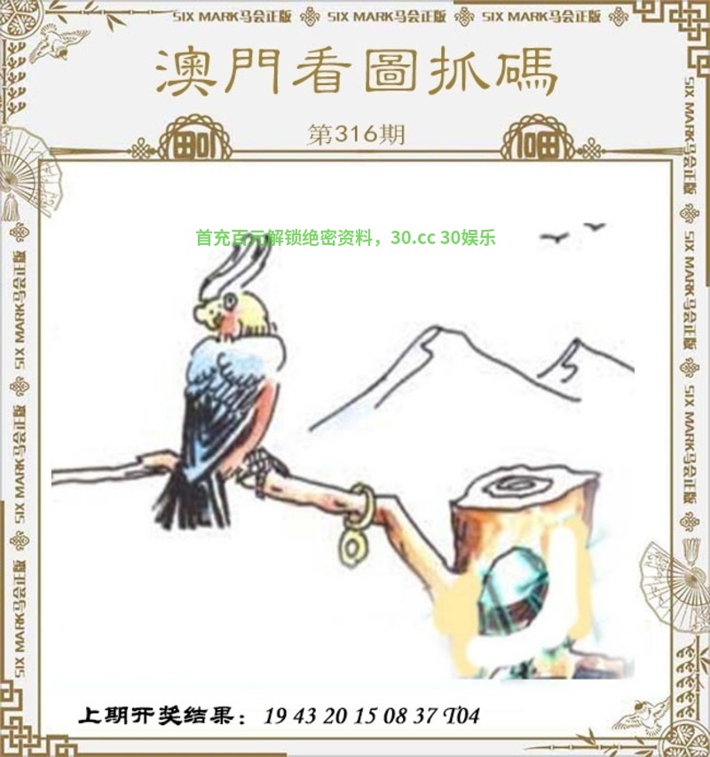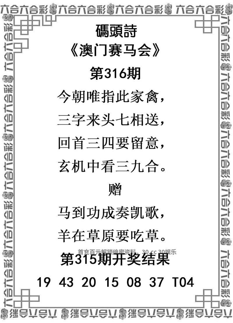 | 316期⑩码 | 30.06.19.21.15.24.46.41.32.04 | 马24中 |